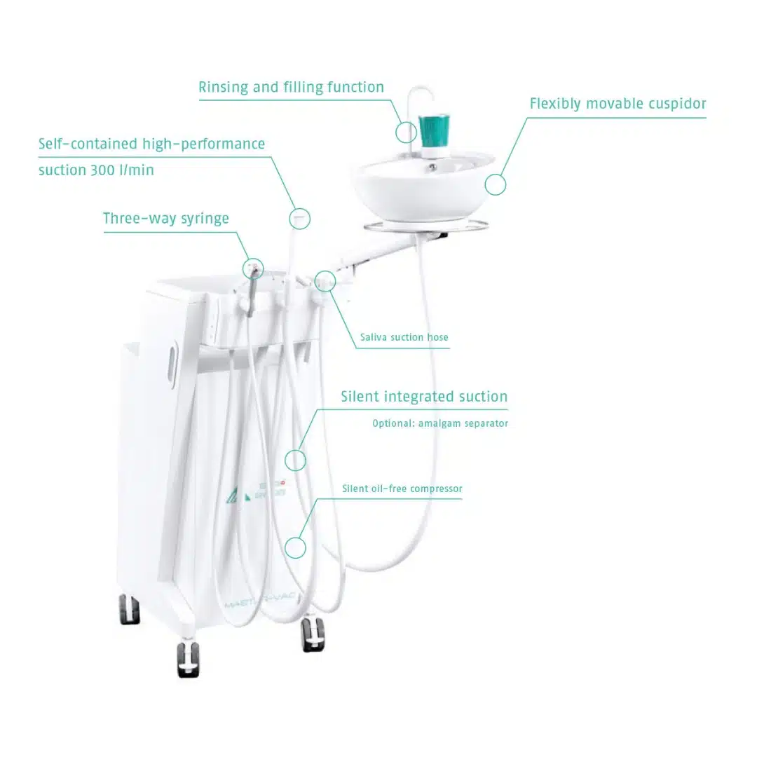 During treatment, you as the dental professional will be assisted by a three-way syringe and an impressive suction capacity (300 l/min) that outperforms many fixed units. No costly installation work and still best comfort due to unique advantages.